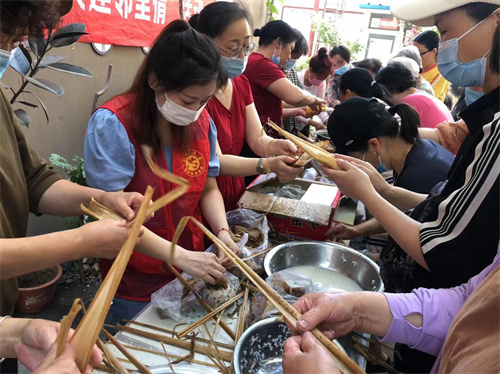 “现在疫情管理的严,你们不要来回跑了,我这边社区正组织包粽子呢,不说了,我得包粽子了啊”,一位大妈风风火火地挂了电话,急切地挤进人群中熟练地包起了粽子,引得大家笑声不断,“谢谢你们啊,今年端午就我和老伴在家,我们包6个就够吃了,我多包点你们分给其他人,大家一起过节”。