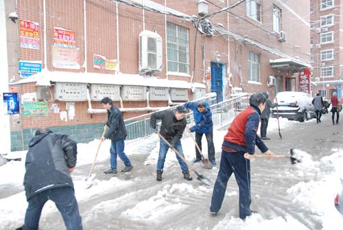 突如其来的一场大雪,为市民的出行造成了不小的麻烦。24日一大早,市供销社机关及部分公司干部职工冒着纷飞的大雪,走上街头清理积雪。(图为干部职工在清理积雪)