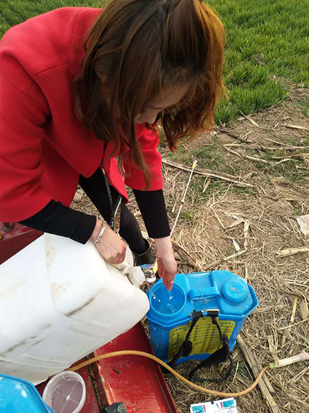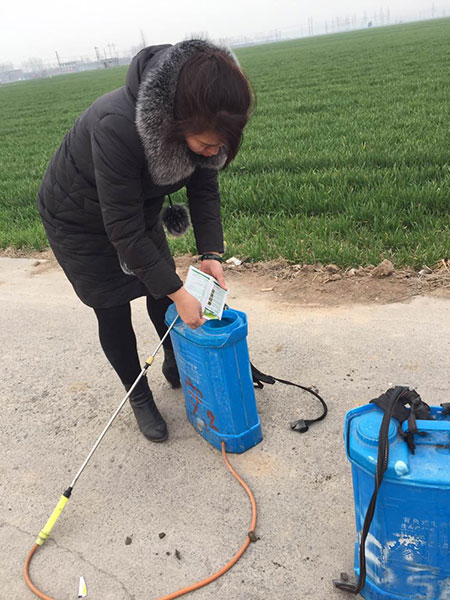 工作人员在托管的地里实地查看地里的草,有哪几种,根据杂草的种类,准备打农药 现场调配农药 工作人员正在农药喷洒