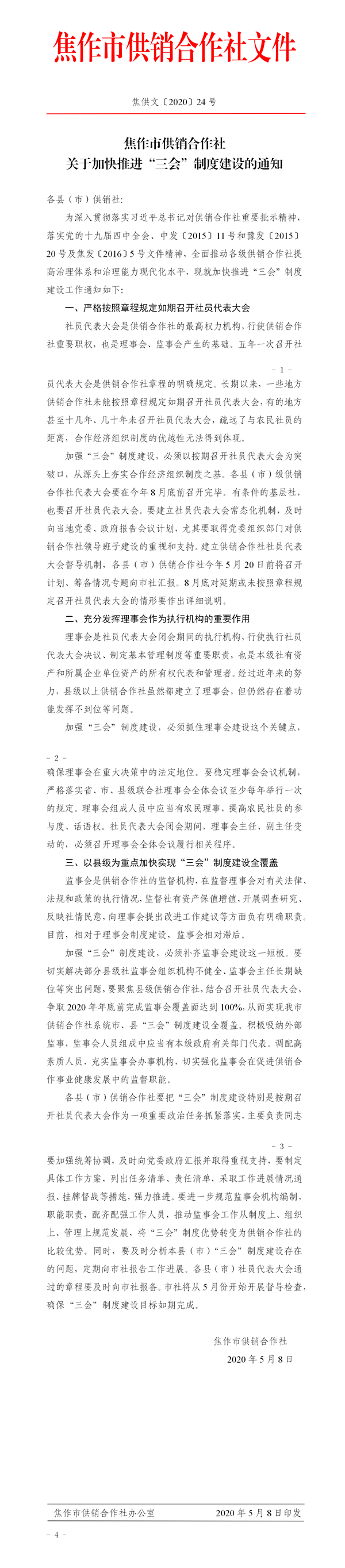 焦作市供销合作社关于加快推进“三会”制度建设的通知