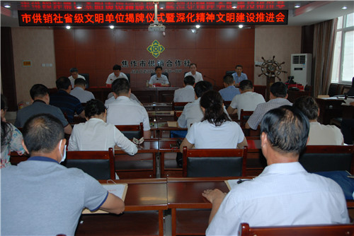 为进一步提高文明单位创建水平,推动文明单位创建工作再上新台阶,6月22日下午,焦作市供销合作社召开了省级文明单位揭牌仪式暨深化精神文明建设推进会。解放区宣传部部长孙迎新莅临会议指导工作,焦作市供销合作社领导毕明奇、双占侠、张中秋、王新旺、张建普出席会议,市社直属单位主要负责人、机关全体工作人员参加会议。