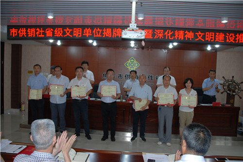 市社党组成员、副主任张中秋宣读了关于表彰2019年度创建省级文明单位的先进集体和先进个人的决定,经市社党组研究决定对土产公司等7个先进集体和王晓东等15名先进个人予以通报表彰。要求全系统干部职工要向先进学习,以更加饱满的热情、更加昂扬的斗志、更加务实的作风、更加坚定的信心,勇于开拓,不断创新,为深化精神文明建设,推进供销事业改革发展再立新功、再铸辉煌。