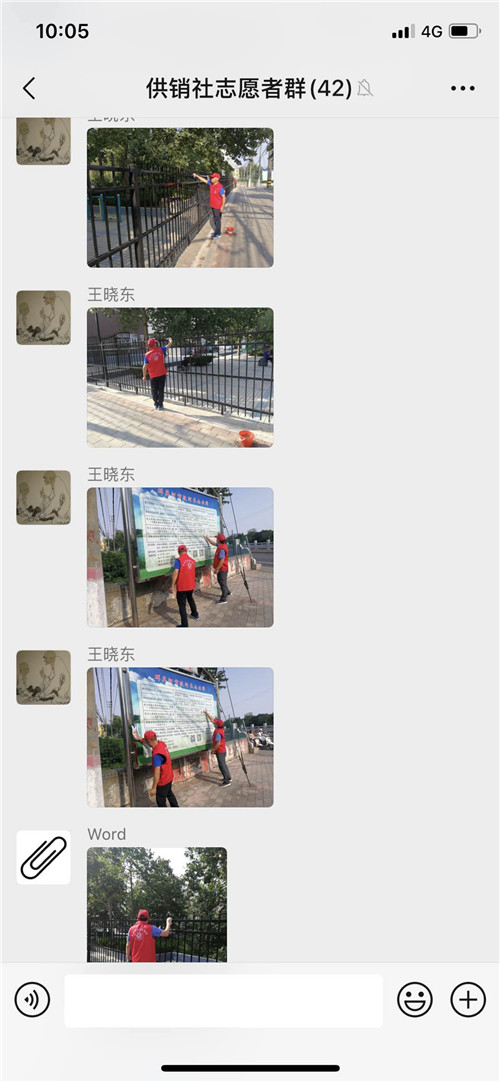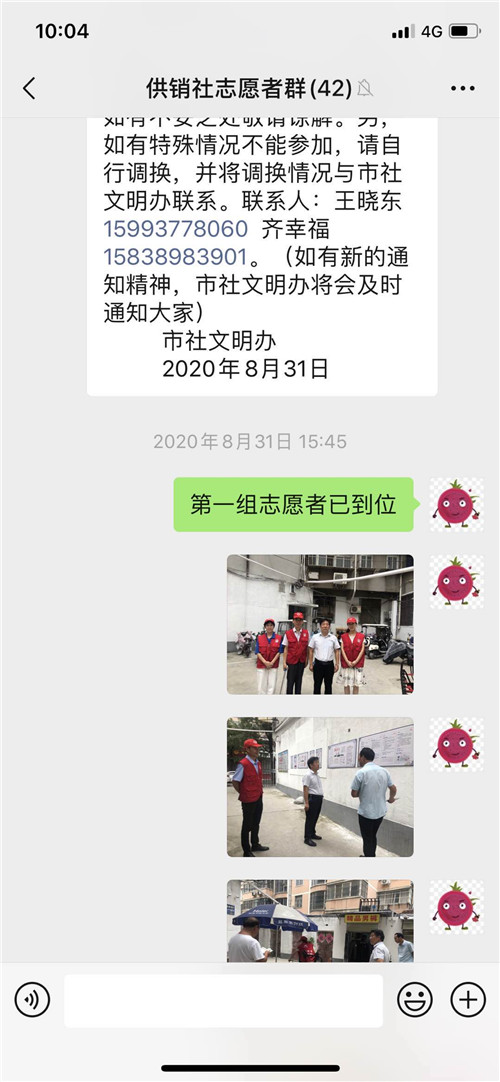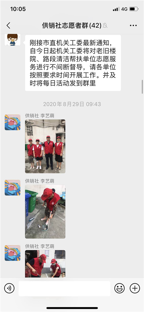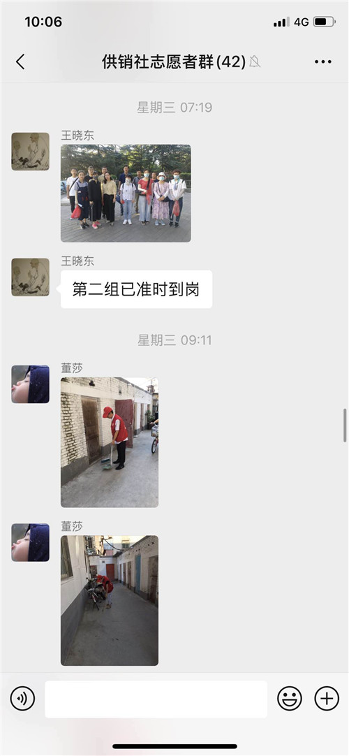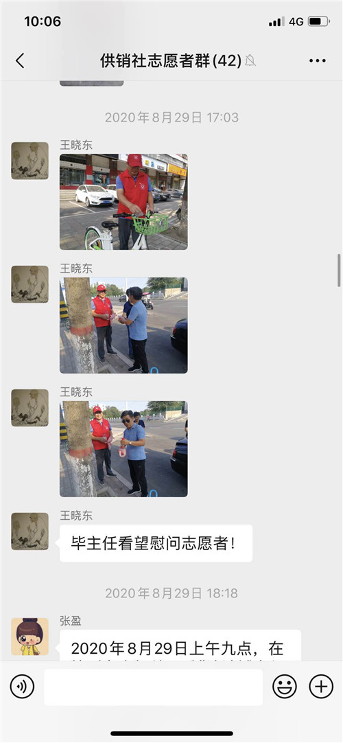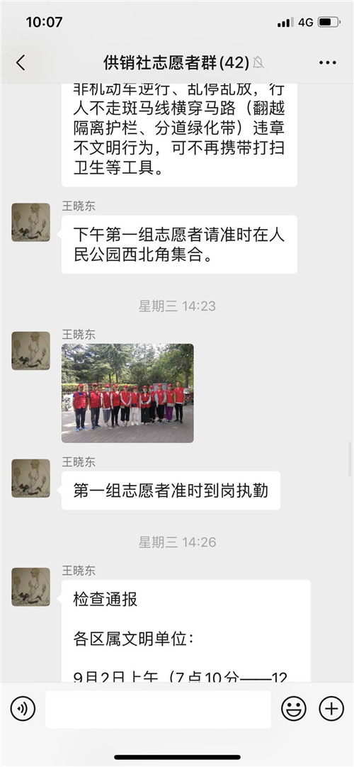 在这里我给大家分享几段感人故事。土产公司张宝珠,家中两个孩子,大的小学刚刚开学,还需要接送,小的还在哺乳期,但她没有提出过困难,把孩子交给了家人,只是在执勤中请假半小时回去喂奶;福安公司冯军红,前段时间腿部刚做过手术,伤口还没有痊愈,不能长时间站立,然而她在两天的执勤中,没有提出过要休息,坚持在岗位上;针棉公司冯志华,不仅按要求坚持志愿服务活动,而且在执勤之余,抽时间到公司老旧楼院打扫卫生;市社机关韩绘琴,在执勤过程中几近晕倒,仍坚守在岗位上,我对她说,顶不住了就坐下休息会儿,她说“我穿着‘红马甲’我还能坚持”……